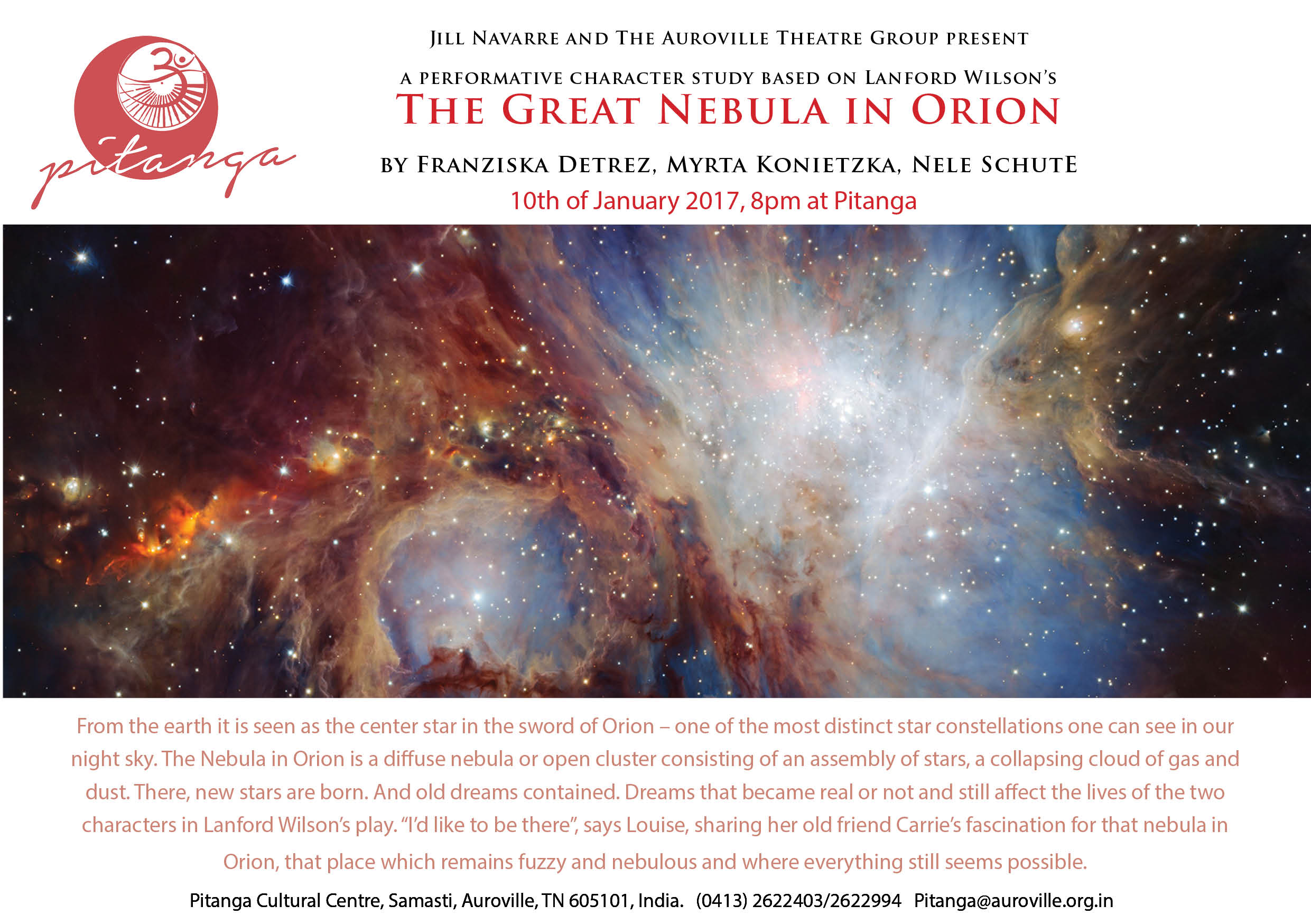 In 2018 Franziska directed Lanford Wilson’s two-hander “The Great Nebula in Orion” in collaboration with Pitanga cultural centre for an international audience in Auroville. The play deals with the stories of two women reflecting on their common past while they have been moving further and further away from each other over the years.